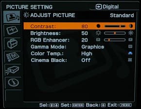 При любом подключении доступны для регулировки контрастность, яркость и цветовая температура (параметр Color Temp., только три значения — High, Middle и Low), а также присутствует параметр Cinema Black, включающий режим пониженной яркости лампы.