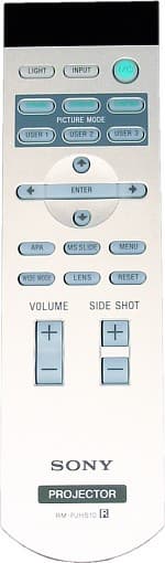 Пульт, довольно большой и широкий. В руке лежит удобно, а до любых кнопок можно дотянуться не перехватывая его в руке. В принципе, кнопки хорошо дифференцированы и находятся на ощупь, но постоянно вместо стрелки вниз нажимается кнопка вызова меню Memory Stick (MS SLIDE), а кнопка влево-ENTER-вправо слишком широкая. Пользоваться джойстиком на самом проекторе гораздо удобнее. Надписи зеленой краской на втором ряду кнопок практически не читаются. Подсветка (включается кнопкой LIGHT) очень слабая. На проекторе и спереди и сзади есть по ИК-приемнику, а значит пультом можно будет без проблем пользоваться практически при любом расположении проектора.