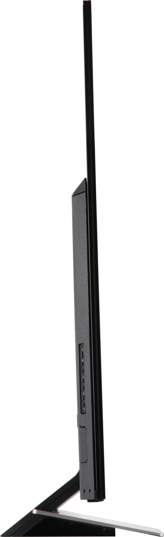 Дизайн этого телевизора очень строгий, если не сказать утилитарный, что в данном случае можно только приветствовать — чем меньше зритель отвлекается от происходящего на экране, тем глубже погружение. Но и в магазине привлечь покупателя телевизор чем-то должен. В данном случае глаз останавливается на тонком хотя бы с виду корпусе, точеной рамке, незаметно переходящей в плоскость собственно экрана, и на рубленных линиях подставки.
