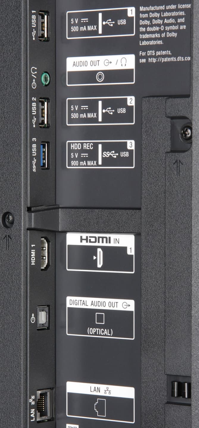 Таблица с характеристиками в начале статьи дает представление о коммуникационных возможностях телевизора. Все разъемы стандартные, полноразмерные и размещены более-менее свободно и с запасом пустого пространства перед ними. Руководство к телевизору (29 страниц) скупо на описание особенностей функционирования входов, но хоть поддерживаемые типы сигналов для части входов перечислены. Отметим наличие одного входа USB 3.0 с заявленным максимальным током в 900 мА, который рекомендуется использовать для подключения внешнего жесткого диска, а также многофункциональный аудиовыход, режим работы которого выбирается в меню.