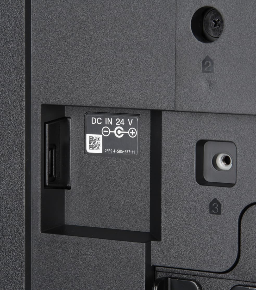 На нижнем торце блока экрана есть две разнесенные от центра решетки, за которыми просматриваются два вытянутых громкоговорителя, а еще два отверстия, видимо, являются рупорами (фазоинверторов?) размещенных внутри корпуса громкоговорителей (заявлено, что их всего четыре). Телевизор имеет полностью пассивное охлаждение — воздух циркулирует через щели и решетки вверху и внизу утолщенной части задней панели. Работает телевизор от внешнего блока питания в пластиковом корпусе в виде вытянутого кирпича. Его размеры составляют 287×75×33 мм, а масса равна 729 г. К розетке этот БП подключается с помощью толстого кабеля длиной 190 см с евровилкой на одном конце и с разъемом IEC C17 (как для типичного БП от ПК, только без заземления) на другом, а к телевизору ток идет по кабелю длиной в 260 см с проводами в 14 AWG и с особыми плоскими разъемами на концах.
