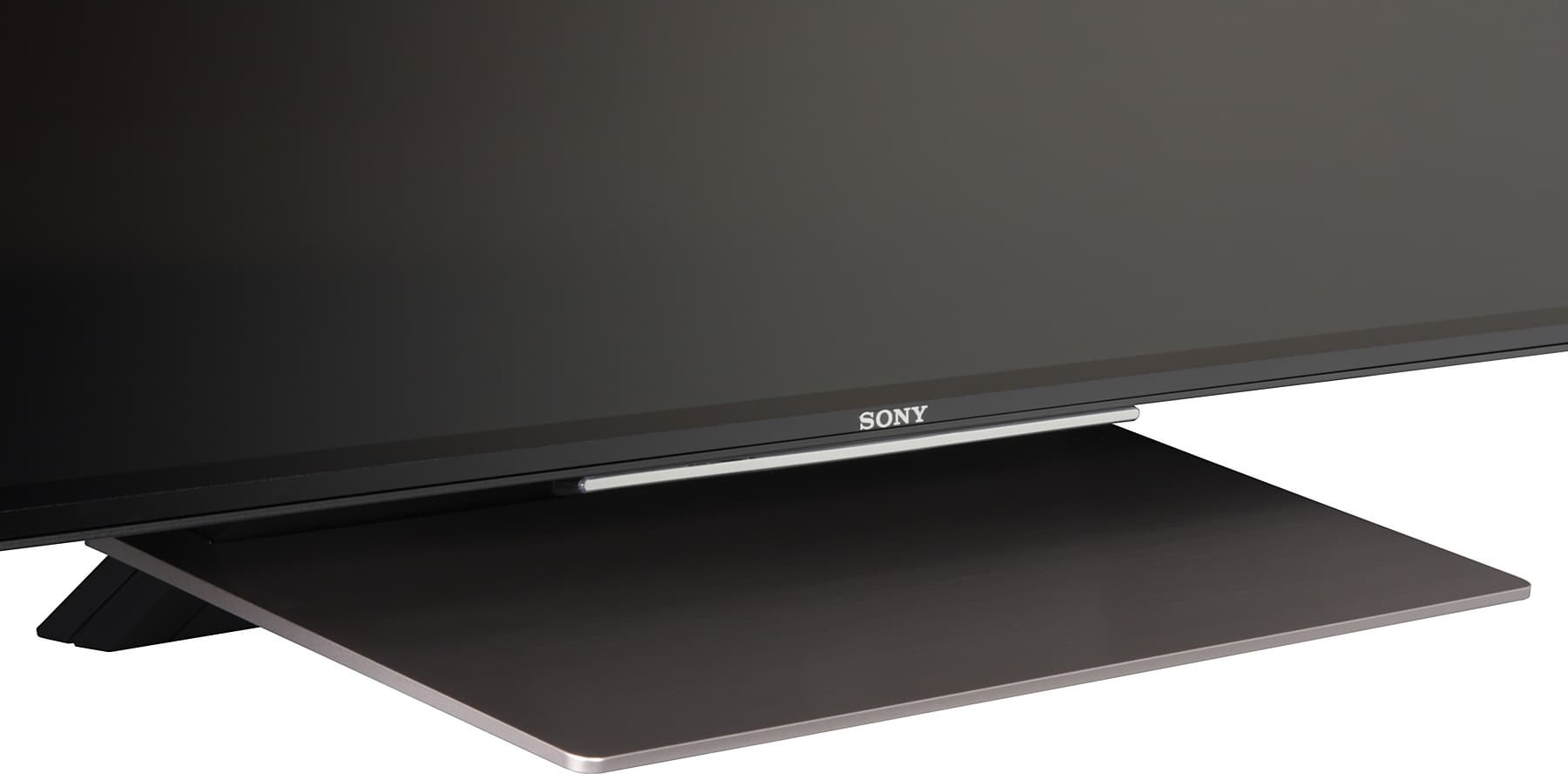 Геометрию подставки можно описать как скрещенные пластины. Выступающая вперед часть подставки имеет накладку из алюминия снаружи с грубой шлифовкой, анодированную и тонированную в серый цвет. В местах контакта подставки с плоскостью стола или тумбы есть приклеенные резиновые накладки. Несущие элементы подставки изготовлены из стали и легкого сплава. Жесткость этой конструкции высокая, телевизор стоит устойчиво и чуть наклонен назад.