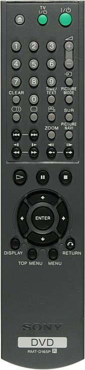 Идущий в комплекте с DVP-NS955 очень на него похож, но имеет маркировку RMT-D172P, дополнительные 8 кнопок между цифровым и курсорным блоками и переключатель TV/DVD. Оригинальный пульт позволяет ограниченно управлять телевизорами и ресиверами от Sony и от других производителей. Относительно доставшегося нам пульта можно сказать, что он удобный, хорошо лежит в руке, самые нужные кнопки легко находятся на ощупь, кнопки мягкие и чувствительные.