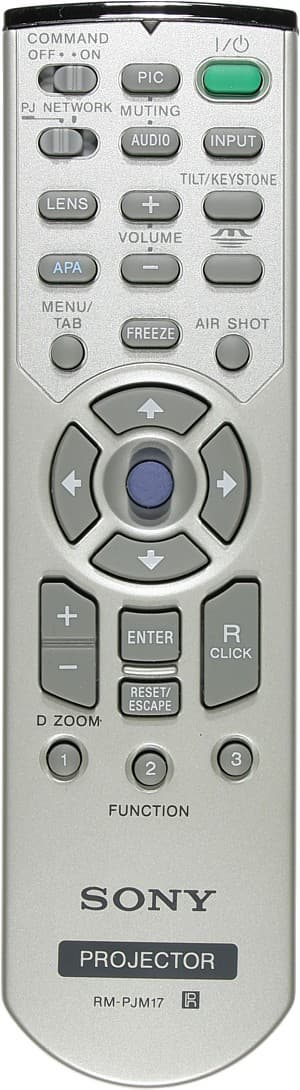 Проектор комплектуется точно таким же пультом ДУ, как ряд других моделей презентационных проекторов от Sony. Пульт довольно большой, в руке лежит удобно, самые нужные кнопки легко находятся на ощупь, подсветки нет. Есть движок включения/выключения, предохраняющий от случайного разряда элементов питания. Проектор, подключенный к компьютеру по USB, распознается как HID-устройство. При этом кнопка R CLICK на пульте эмулирует нажатие на правую кнопку мыши, кнопка снизу на пульте (прямо под указательным пальцем) — на левую, а синий джойстик передвигает курсор. Джойстик тугой и без предварительной тренировки быстро передвинуть курсор мыши в нужное место очень сложно.