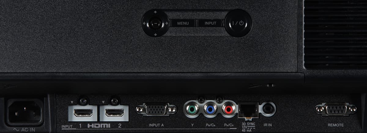 Намеченная тенденция избавляться в Full HD устройствах от композитного и S-Video интерфейсов поддержана — в этом проекторе их нет. Проектор оснащен двумя HDMI-, VGA- и компонентным входами. Разъем mini D-sub 15 pin универсальный — он совместим как с компьютерными VGA-сигналами, так и с компонентными цветоразностными и GBR-видеосигналами. Тип видеосигнала на этом разъеме определяется автоматически, но можно указать его принудительно. Переключение между источниками осуществляется перебором всех с помощью кнопки INPUT на корпусе проектора или на пульте. При этом если включена функция автопоиска, то проектор автоматически пропускает неактивные входы. Гнездо миниджек предназначено для подключения внешнего ИК-приемника. Заявлена ограниченная поддержка управления по HDMI — проектор может автоматически включаться при включении (запуске на воспроизведение) подключенного по HDMI-оборудования, наоборот, выключать подключенное оборудование при выключении. Однако, подключенный Blu-ray-плеер Sony BDP-S300 проектором не обнаруживался и на команды никак не реагировал. Разъем RJ45 предназначен для подключения внешнего излучателя сигналов синхронизации затворных очков. Смысл в том, что пользователь может использовать доступные сетевые кабели нужной длины и стандартные разъемы для подключения опционального излучателя TMR-PJ1. Интерфейс RS-232C, по всей видимости, предназначен для удаленного управления и, возможно, обновления прошивки.