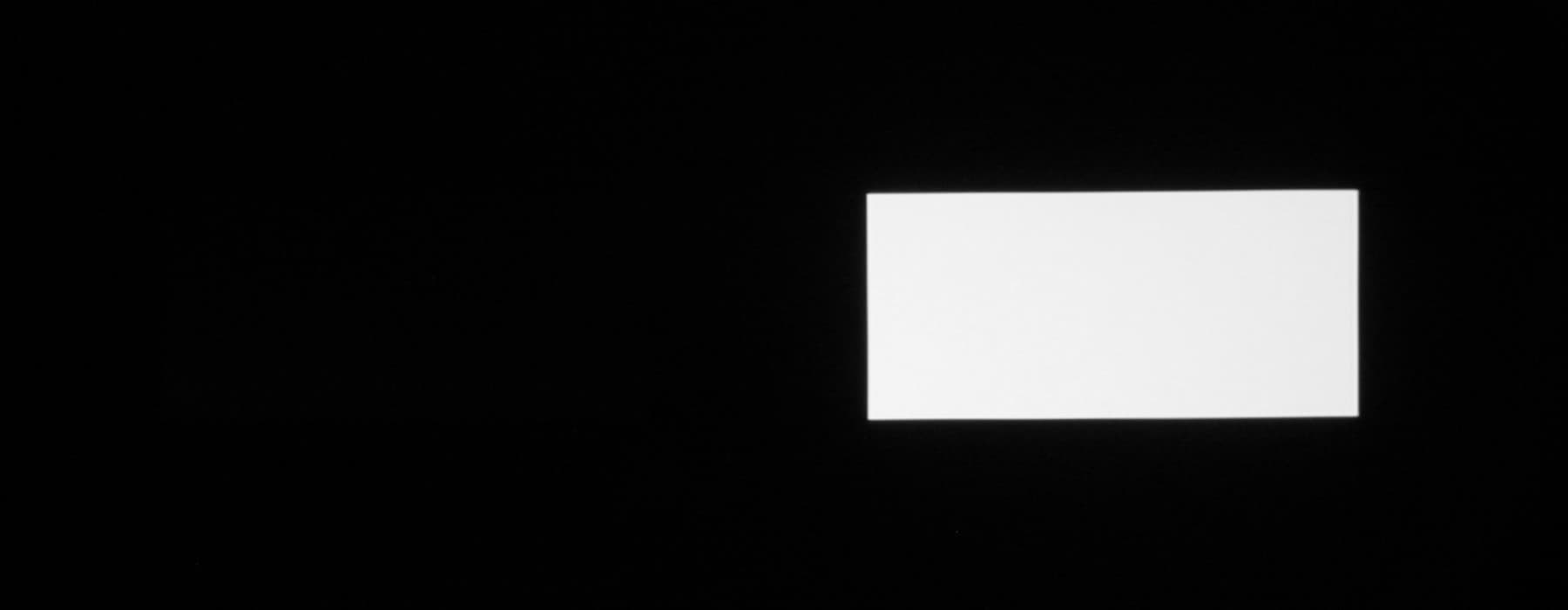Для тестирования эффективности разделения для глаз мы вывели три тестовых изображения с черным прямоугольником на белом фоне, с белым прямоугольником на черном фоне и со светло серым прямоугольником на темно-сером фоне. В стереопарах прямоугольники были смещены относительно друг друга, поэтому при просмотре через очки при 100%-ном разделении можно было бы видеть только один прямоугольник. Фотографии ниже сделаны через очки при сигнале 60 кадр/с, при этом экспозиция подбиралась так, чтобы белое поле на фотографиях было максимально ярким, но еще не пересвеченным. Яркость 3D-очков установлена на максимальное, среднее и на минимальное значение: