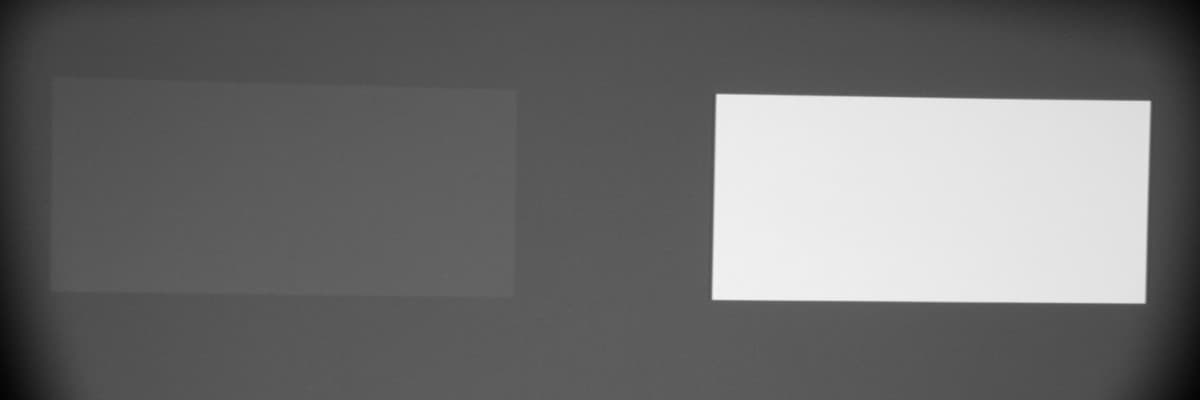 Максимальный световой поток практически равен паспортному значению (заявлено 2000 лм). Равномерность белого поля приемлемая. Контрастность очень высокая. Также мы измерили контрастность, измеряя освещенность в центре экрана для белого и черного поля, т. н. контрастность full on/full off.