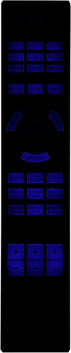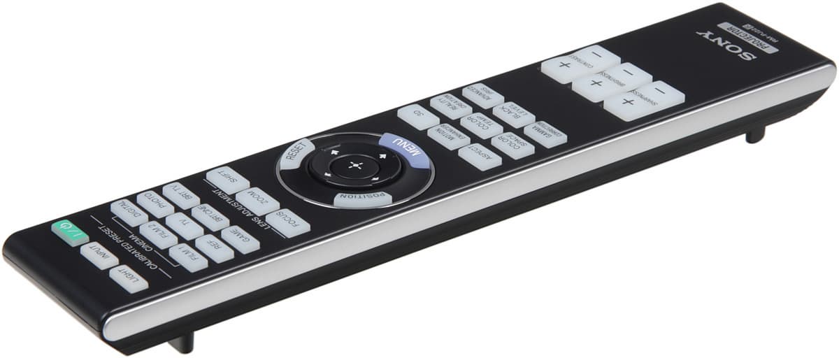 Пульт изготовлен из пластика с матовым черным покрытием. Дизайн выполнен в фирменном стиле, включая продольную ребристость на нижней поверхности. По бокам — вставки из пластика с серебристым покрытием. Пульт удобно лежит в руке. Самые нужные кнопки, включая группу с навигационным кольцом в центре и три кнопки-качалки, легко находятся на ощупь. Есть достаточно яркая синяя светодиодная подсветка всех кнопок, кроме трех в первом ряду, которые фосфоресцируют. Включается подсветка кнопкой LIGHT.