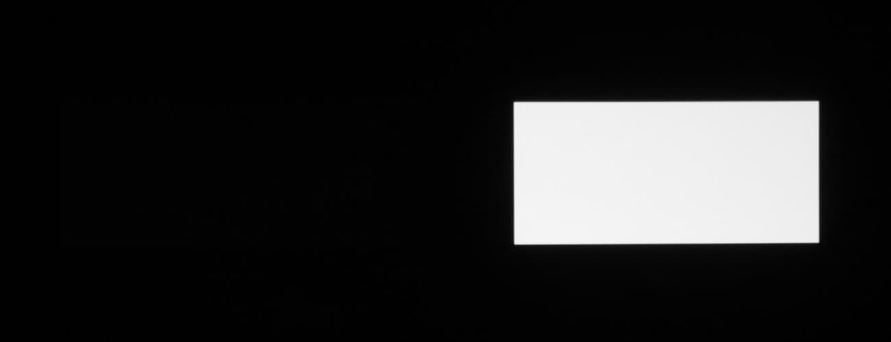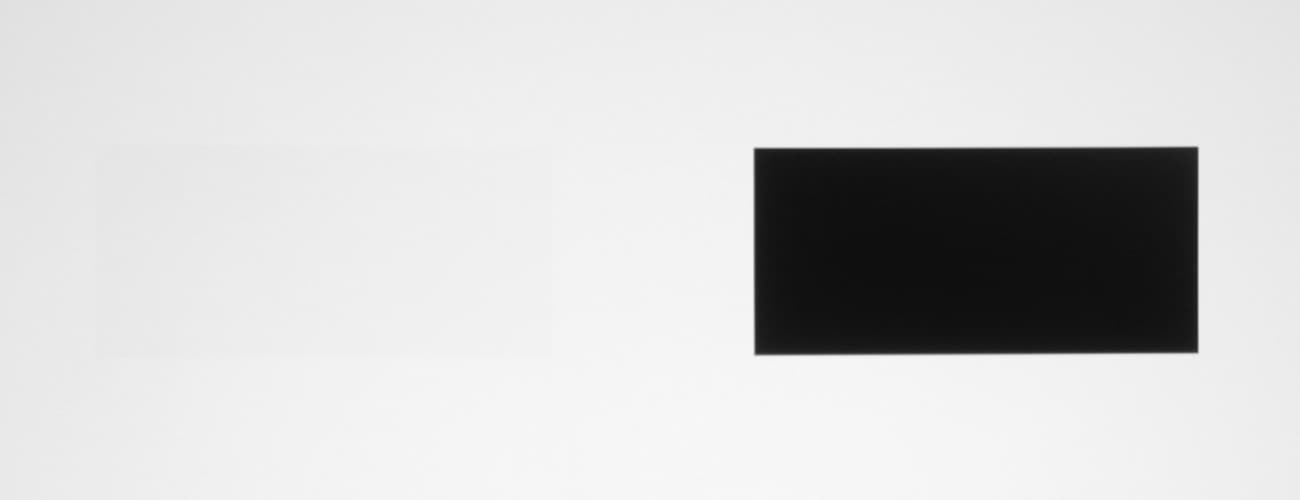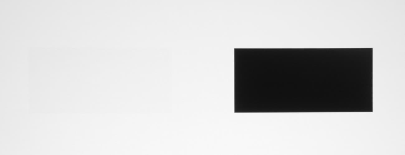 Для тестирования эффективности разделения для глаз мы вывели три тестовых изображения с черным прямоугольником на белом фоне, с белым прямоугольником на черном фоне и со светло-серым прямоугольником на темно-сером фоне. В стереопарах прямоугольники были смещены относительно друг друга, поэтому при просмотре через очки при 100% разделении можно было бы видеть только один прямоугольник. Фотографии ниже сделаны через очки при сигнале 60 кадр/с, при этом экспозиция подбиралась так, чтобы белое поле на фотографиях было максимально ярким, но еще не пересвеченным. Параметр Яркость 3D установлен высокое и стандартное значение: