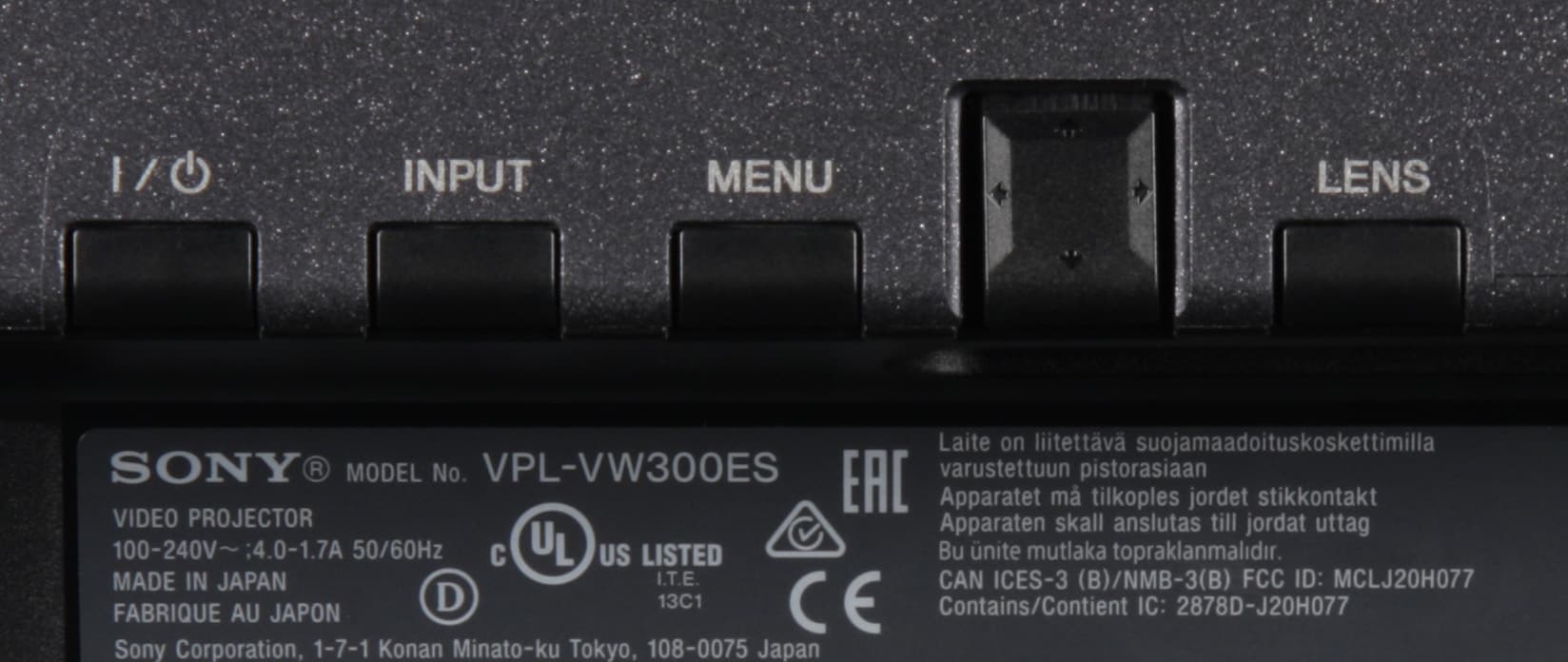 Внешне проектор на первый взгляд невозможно отличить от модели VPL-VW500ES, на второй, наверное тоже. Проектор относительно большой и тяжелый — те же 14 кг и габариты. Дизайн корпуса строгий и симметричный относительно продольной плоскости. Цвет — черный. Верхняя панель, плавно переходящая в боковые поверхности имеет очень необычное покрытие — матовое, крупнозернистое и с мелкими блестками, на ощупь оно напоминает наждачную бумагу. Пыль и следы от пальцев на таком покрытии заметны очень мало. Чистить его можно тряпкой, из которой не лезут волокна, или жесткой щеткой. Фронтальная панель, напротив, изготовлена из пластика с зеркально-гладкой и неустойчивой к появлению царапин поверхностью.