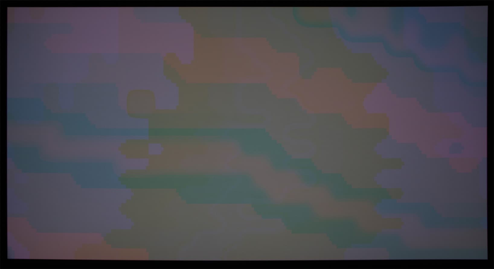 При HDMI-подключении к компьютеру можно установить режим, соответствующий разрешению проектора — 4096 на 2160 пикселей. При таком разрешении поддерживается до 60 кадр/с включительно и 8 бит на цвет при кодировании цвета YUV 4:2:0. Белое поле выглядит равномерно освещенным и не имеет явных цветовых разводов. Черное поле равномерное, бликов и цветных разводов нет. Геометрия практически идеальная — прогиб верхнего края проекции внутрь при сдвиге вверх на 50% не превышает 3-4 миллиметра на почти 2 м ширины. Четкость очень высокая, но вертикальные тонкие цветные линии толщиной в один пиксель выводятся с потерей цветовой составляющей. Хроматические аберрации плюс несведение матриц присутствуют, и ширина неяркой цветной каемки на границах контрастных объектов к углам проекции достигает 1/3 пикселя. Фокусировка очень хорошая на всех участках области проекции. Темную границу между пикселями разглядеть не получилось. Отметим, что в режиме 4К количество доступных настроек и функций заметно сокращается, например вставка промежуточных кадров уже не работает, но работает, к примеру, вставка черного кадра. Мира с черными полосками (вертикальными или горизонтальными) в один пиксель шириной выявила интересный узор цветного оттенка в пространстве между линиями: