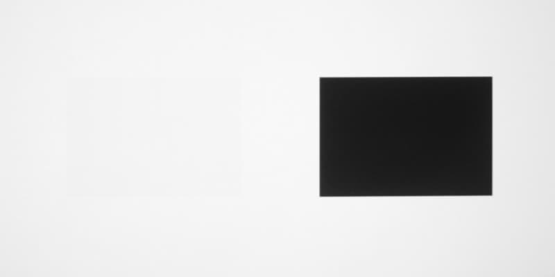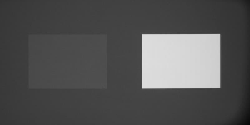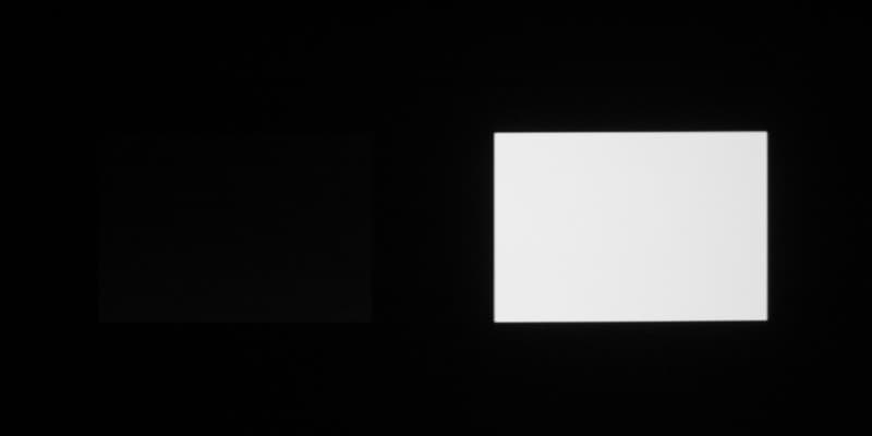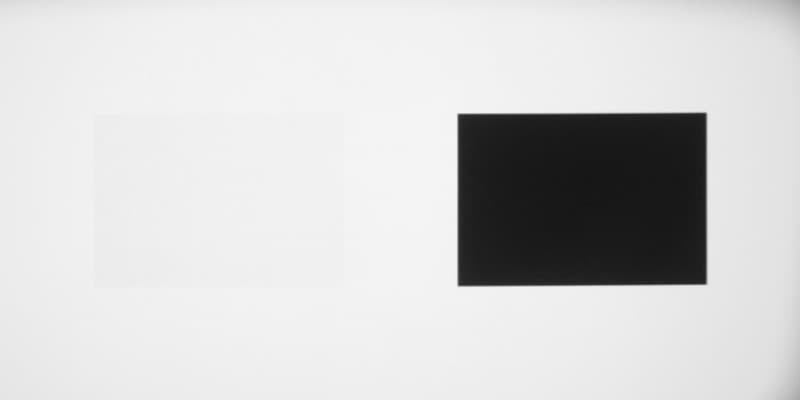 Для тестирования эффективности разделения для глаз мы вывели три тестовых изображения с черным прямоугольником на белом фоне, с белым прямоугольником на черном фоне и со светло-серым прямоугольником на темно-сером фоне. В стереопарах прямоугольники были смещены относительно друг друга, поэтому при просмотре через очки при 100%-ном разделении можно было бы видеть только один прямоугольник. Фотографии ниже сделаны через очки при сигнале 24 кадр/с, при этом экспозиция подбиралась так, чтобы белое поле на фотографиях было максимально ярким, но еще не пересвеченным. Параметр Яркость 3D установлен на высокое и стандартное значение:
