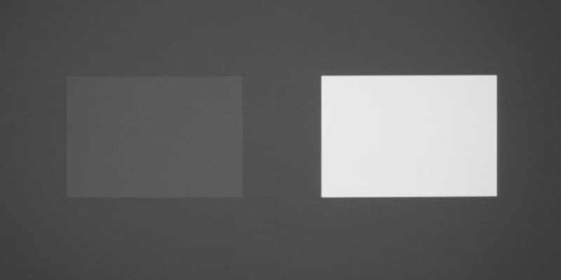 Максимальный световой поток не значимо ниже паспортного значения (заявлено 1500 лм). При этом поток (и яркость изображения на экране) закономерно снижается при уменьшении яркости лампы и при выборе стандартной цветовой температуры (и все это можно включить одновременно). Равномерность белого поля отличная, предположение почему, будет изложено ниже. Контрастность очень высокая. Также мы измерили контрастность, измеряя освещенность в центре экрана для белого и черного поля, т. н. контрастность full on/full off.