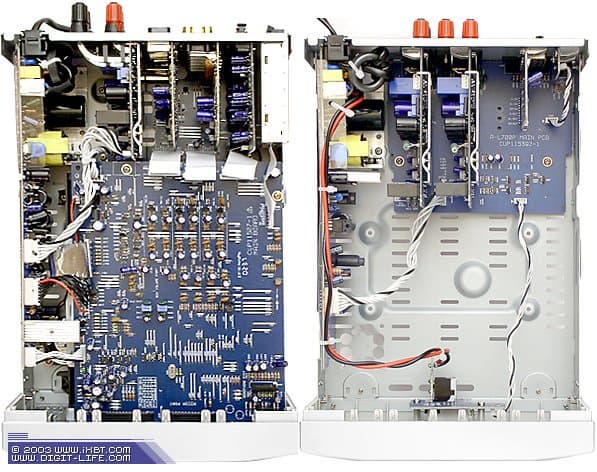 DR-L700 имеет очень плотную компоновку элементов внутри корпуса. Возможно, поэтому под приводом DVD и пришлось установить небольшой, но высокооборотистый кулер, который работает всё время, пока включён вход DVD. При включении любого другого входа (в это время привод DVD не задействован) кулер не работает. Стоит сказать, что в тихой комнате шум от работы кулера довольно хорошо слышен на расстоянии двух-трёх метров. Правда, при прослушивании музыки он не мешает совершенно. Ситуация с A-L700P противоположная: корпус практически пуст. Лишь в задней части расположены усилители, а на боковой стенке разместился импульсный блок питания и управляющая электроника.