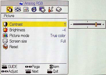 Некоторые часто используемые функции вызываются напрямую: при помощи кнопок на проекторе или на пульте. Гораздо большее число настроек доступно через экранное меню. Для навигации по меню используется целых 7 кнопок (MENU, ENTER, EXIT, стрелки вверх-вниз, вправо-влево) — явно можно было сделать все более простым и удобным. Однократное нажатие на кнопку MENU вызывает краткое (обзорное) меню, где находятся только самые нужные с точки зрения разработчиков пункты.
