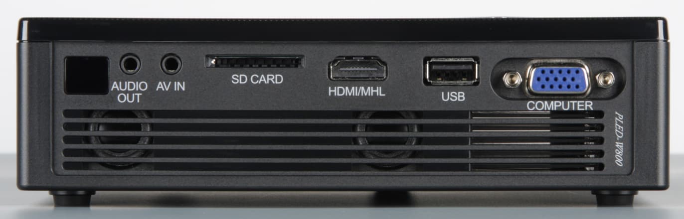 Проектор оснащен стандартными разъемами. Правда четырехконтактное гнездо миниджек 3,5 мм, через которое вводится аналоговый звук / композитное видео, скорее всего, потребует переходника на разъемы RCA, который производитель положить поскупился, как и кабель HDMI на Micro-USB, который необходим для реализации возможности прямого подключения устройств по MHL. Есть автоматическое обнаружение сигнала на входах (его можно отключить). К USB-порту допустимо подключать USB-накопители. Тестирование показало, что мощности порта хватает для работы типичного USB HDD с диском 2,5 дюйма и как минимум поддерживается файловая система FAT32 (заявлена поддержка FAT16, FAT32, NTFS, exFAT). Функциональность проектора можно расширить за счет использования опционального Wi-Fi-адаптера, подключаемого все к тому же разъему USB. Такого адаптера у нас не было. Есть встроенный картовод для карт SD и встроенная память на 2 ГБ. Эти два типа памяти дополняют USB-накопители в части поддержки воспроизведения с них мультимедийных файлов и документов (есть ограничение на количество папок, файлов и уровень вложения папок — см. руководство). Файлы с носителей можно копировать на встроенную память силами самого проектора. Также заявлена возможность доступа к встроенной памяти с компьютера и передача изображения с компьютера по USB, но для этого, вроде как, нужен кабель USB-A на USB-A, который производитель также в комплект не доложил.