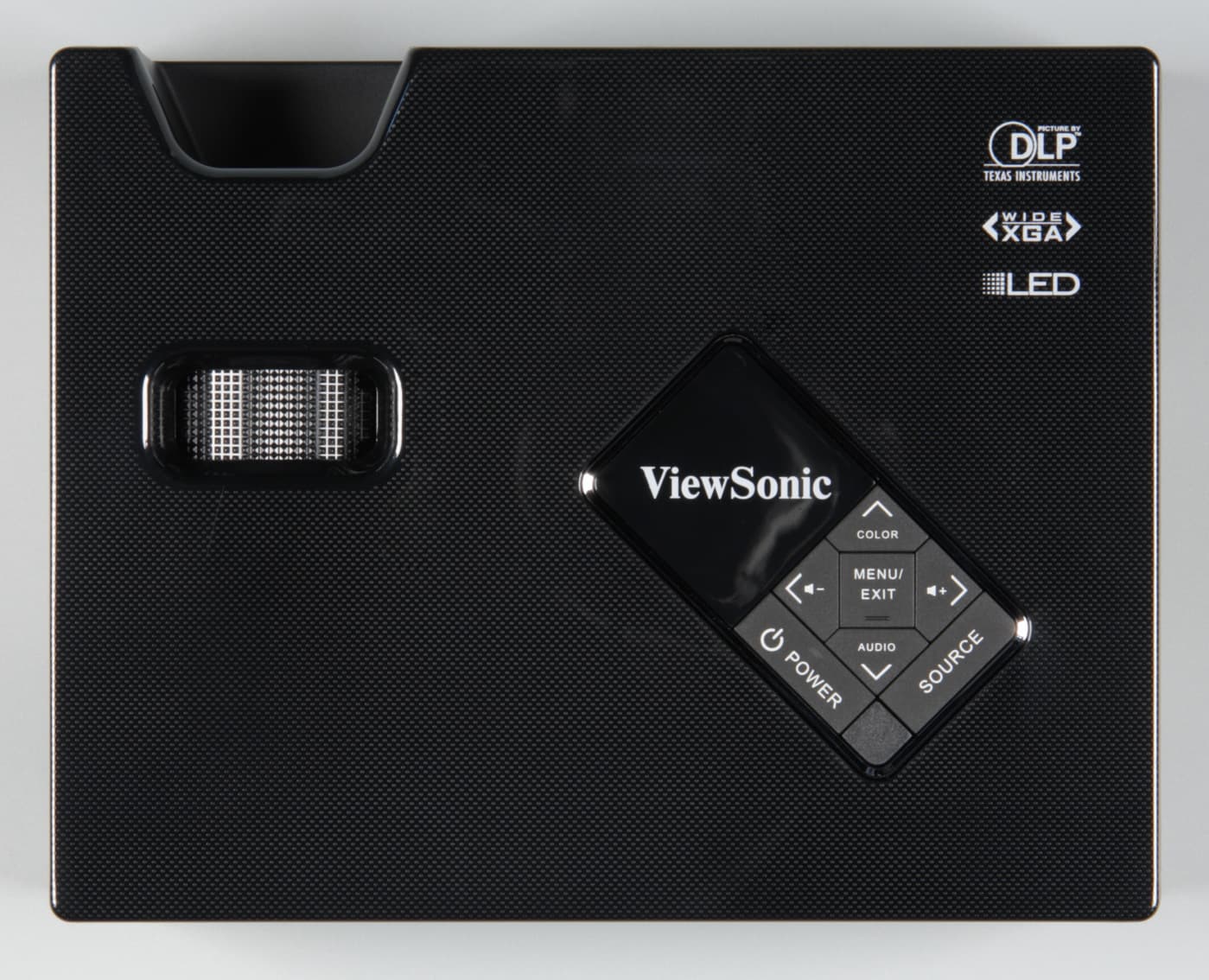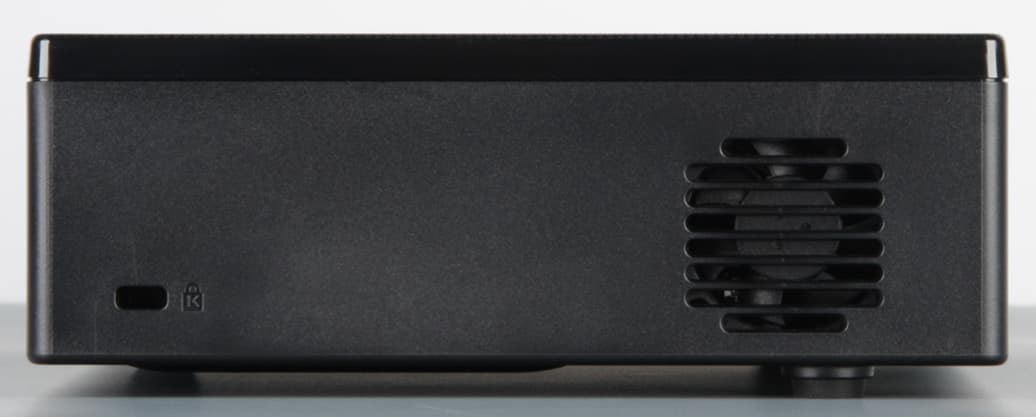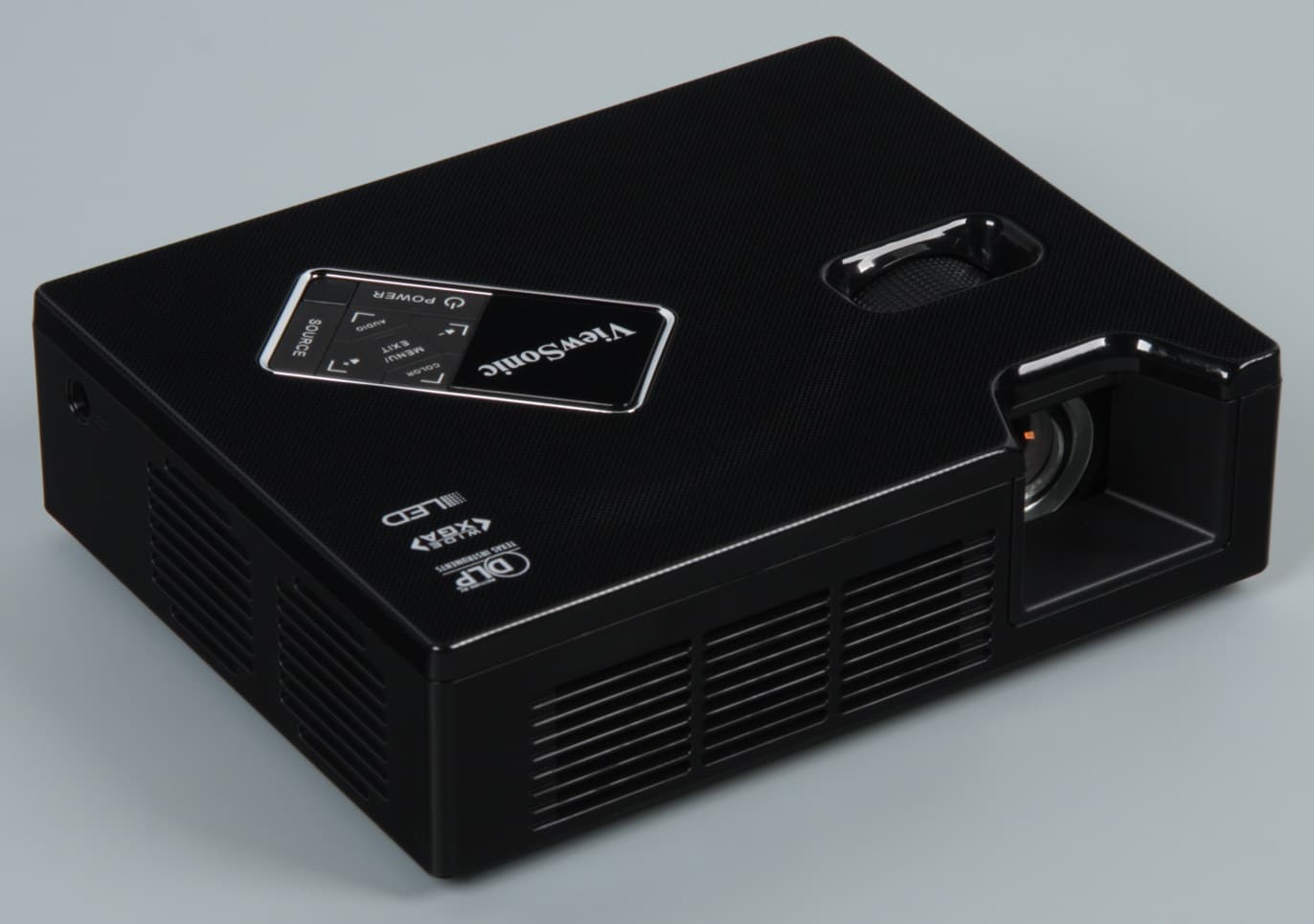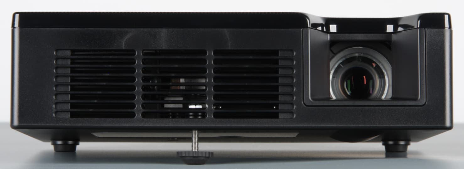 За боковыми решетками можно разглядеть небольшие вентиляторы, за задней — крохотные громкоговорители с круглыми диффузорами. На верхней панели над объективом есть ниша, открывающая доступ к ребристому кольцу фокусировки, а правее и ближе к задней панели находятся кнопки управления и индикатор состояния (неярко светится красным в режиме ожидания, мигает зеленым во время переходных процессов и ровно горит зеленым при работе проектора).