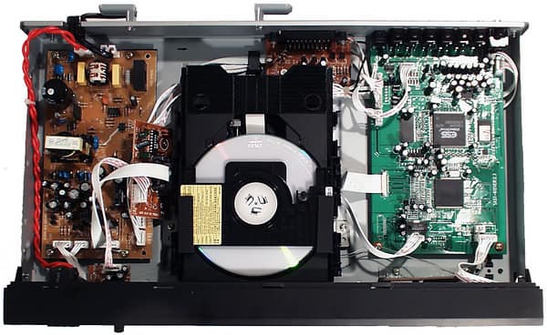 Слева находится блок питания, выполненный по импульсной схеме. Между блоком питания и DVD-приводом разместилась плата микрофонного усилителя и эхо-процессора для караоке. Соседство с импульсным БП неэкранированной микрофонной платы не выглядит удачным конструктивным решением. На передней панели находятся платы сенсорного управления, VFD-дисплея и микрофонного входа. Справа от DVD-привода находится основная плата электроники плеера. Сзади находится плата аналоговой части интерфейса SCART. Монтаж всех плат аккуратен, все элементы распаяны.