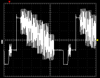 При тестировании осциллограф подключался на композитный видеовыход нагруженный на резистор 75 Ом. Вертикальный масштаб — 0,2 В/деление, горизонтальный — 10 мс/деление.