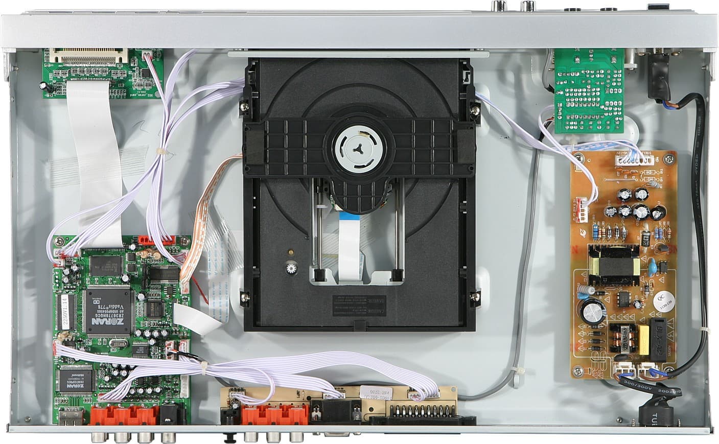 Внутри плеера находятся несколько миниатюрных плат с электроникой, DVD-привод и много свободного пространства. Плеер основан на чипсете от Zoran Corporation. Главным в нем является многофункциональный мультимедийный процессор Vaddis 7 (ZR36778). Помимо всего прочего в него интегрированы 4 видеоЦАПа (54 МГц/10 бит), работающие на обычные (не HD) видеовыходы, а работу цифрового HDMI и аналоговых видеовыходов в режиме высокого разрешения обеспечивает микросхема HDXtreme (ZR36721). В аналоговый вид звук преобразует 6-ти-канальный ЦАП CE2766 от CEI Microelectronics (192 кГц/24 бит, 90 дБ динамического диапазона, -86 дБ THD + N). Для усиления и фильтрации аудиосигнала используются три ОУ F4558.
