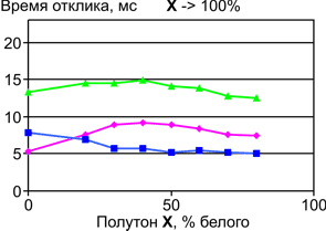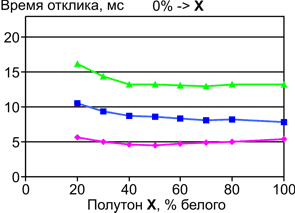 | Времена отклика при переходе между полутонами с разницей 20%. | |