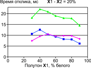Мы измерили времена отклика при переходах от черного к белому и между полутонами. В случае полутонов мы проводили три вида измерений: для фиксированного полутона (X) измеряли время отклика при переходе от черного до X, от X до белого, и для перехода между полутонами в окрестности X, отстоящими от X на фиксированное значение (мы выбрали его равным 10%, так как считаем 20% минимальной имеющей значение разницей между полутонами).