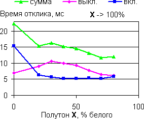 | Времена отклика при переходе от черного до полутона X. | Времена отклика при переходе от полутона X до белого. |