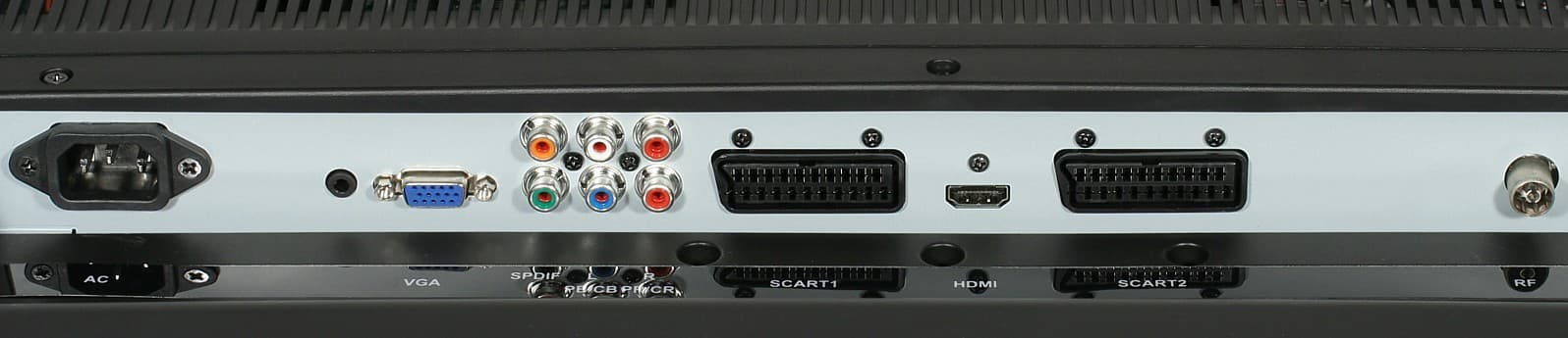 RCA-разъемы компонентного входа расположены неудобно — во втором ряду, близко к стенке. Боковой композитный вход и вход S-Video разделяют одну пару RCA аудиовхода. Аналогично — с VGA- и компонентным входами. В SCART-ах есть аудиовходы. Вход HDMI принимает PCM-цифровой стереоаудиосигнал. Разъем RCA, подписанный как SPDIF, предназначен, как утверждают в Xoro, для сквозного вывода цифрового звука с входа HDMI. Видеосигнал и стереозвук текущего ТВ-канала выводятся на оба SCART-а.