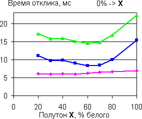 | Времена отклика при переходе между полутонами с разницей 20%. | |