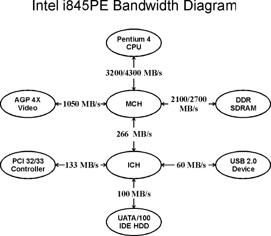 Против обыкновения, приведу здесь один маленький рисунок. Я его назвал конкурсом «Найди одинаковый bandwidth» :). Итак, в чем же основная беда всех современных чипсетов? В узких местах? В медленных шинах? Да ничего подобного! Беда как раз в том, что некоторые из них слишком быстрые :). Вторая же — этих самых шин совершенно невозможное количество. Давайте посчитаем: