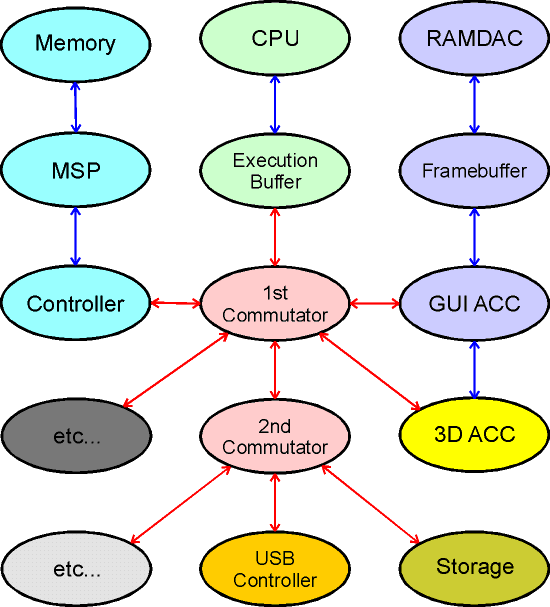 Дополнительно мы вводим чип, который авторы решили назвать «MSP» — Memory Streaming Processor. Он берет на себя часть работы CPU, выполняя независимо от последнего (но в соответствии с поступающими от CPU управляющими командами) операции по копированию данных из одной области ОЗУ в другую, а также различные потоковые операции (из самых примитивных примеров — «взять массив двойных слов с адреса X по адрес Y и умножить каждый элемент массива на Z»). Фактически, это будет некий гибрид ALU/MMU/SIMD-блоков с ограниченной функциональностью, сведенной к выполнению наиболее часто встречающихся операций. Потенциально — с возможностью перепрограммирования части микрокода под исполнение «уникальных» команд (правда, это скорее в будущем…).