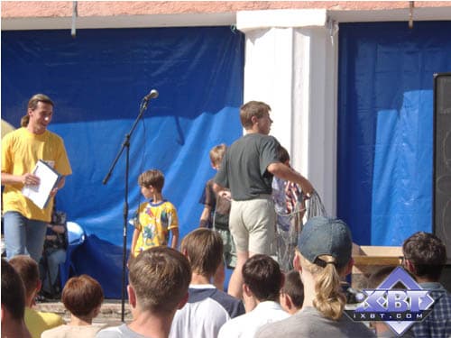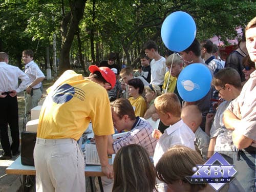 Праздник прошел весело, большую часть пришедших в центральный парк отдыха составляла молодежь. На нескольких площадках проводились всевозможные конкурсы и викторины, причем призы, полученные участниками, были вполне солидными: чего стоит хотя бы процессор Pentium 4 с материнской платой под него, которые ваш покорный слуга привез в Белгород. На одной из площадок всех желающих совершенно бесплатно фотографировали цифровыми камерами, снимки сразу же распечатывались на принтере — отбоя от посетителей не было. На другой площадке проводился конкурс — кто лучше изобразит на асфальте какую-либо часть компьютера, то же делали чуть дальше, но уже из песка. Поверьте, участники искренне интересовались происходящим, а призы были лишь приятным дополнением, но отнюдь не целью прихода на праздник. После подведения итогов и вручения призов началась дискотека — тут уже было просто не протолкнуться, благо дискотеку вели ди-джеи Хит FM.