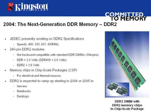 Что касается дальнейших перспектив развития, то Kingston, в полном соответствии с планами Intel, готовится к плановому переходу к поддержке памяти DDR-II. В 2004 году, когда будет официально представлено следующее поколение систем с поддержкой нового типа памяти, Kingston рассчитывает быть одной из первых компаний, представившей свои 240-контактные модули DDR-II на чипах DDR-II-400, DDR-II-533, DDR-II-667 и далее, DDR-II-800. Как и прежде, Kingston намерена оставаться одним из активнейших поставщиков продуктов памяти для всех сегментов рынка — настольных и мобильных ПК, серверных систем.