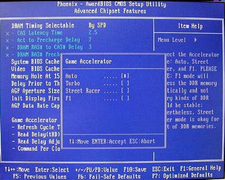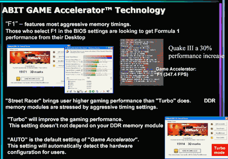 По сути, ABIT GAME Accelerator Technology — это дополнение известной технологии SoftMenu, позволяющей подстраивать режимы работы процессора через BIOS, без открытия крышки ПК. Теперь, ко всему этому благодаря наличию ABIT GAME Accelerator Technoloogy, добавлена возможность тонкой настройки подсистемы памяти. Пользователь получает возможность выбора одного из четырех режимов — Auto, Turbo, Street Racer и F1. Каждый режим может быть настроен пользователем самостоятельно, под конкретные характеристики его системы. Сейчас технология ABIT GAME Accelerator Technoloogy поддерживается системными платами серий IC7, IS7, в том числе, будущей новинкой компании, IC7-MAX3.