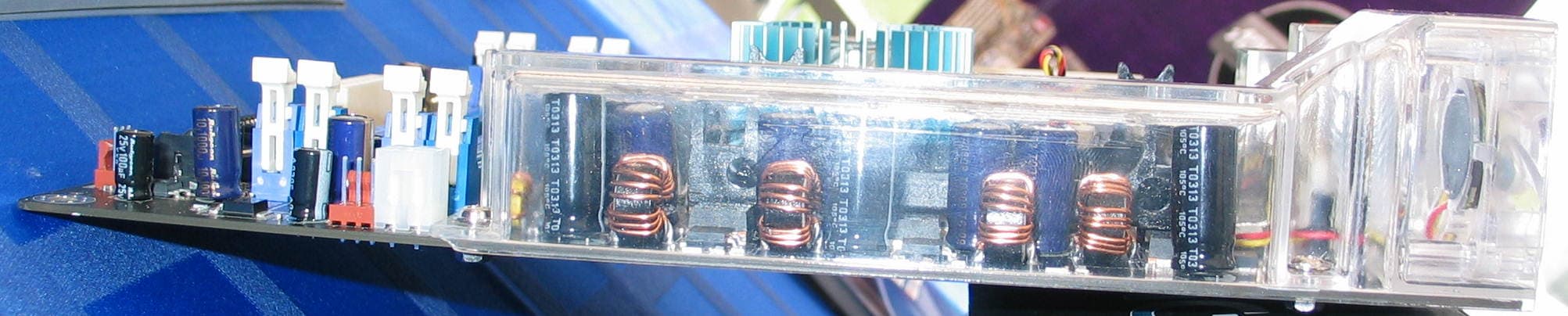 Применение системы охлаждения OTES, известной ранее лишь в составе видео карт от ABIT — не дань моде или прихоть маркетологов: благодаря реализации равномерного обдува всех компонетов системной платы, меньшему нагреву подвергаются и мосты чипсета, и элементы цепей питания, и так далее. Напомню также, что в отличие от других систем общего охлаждения, технология OTES подразумевает работу на выдув горячего воздуха из корпуса, а не наоборот.