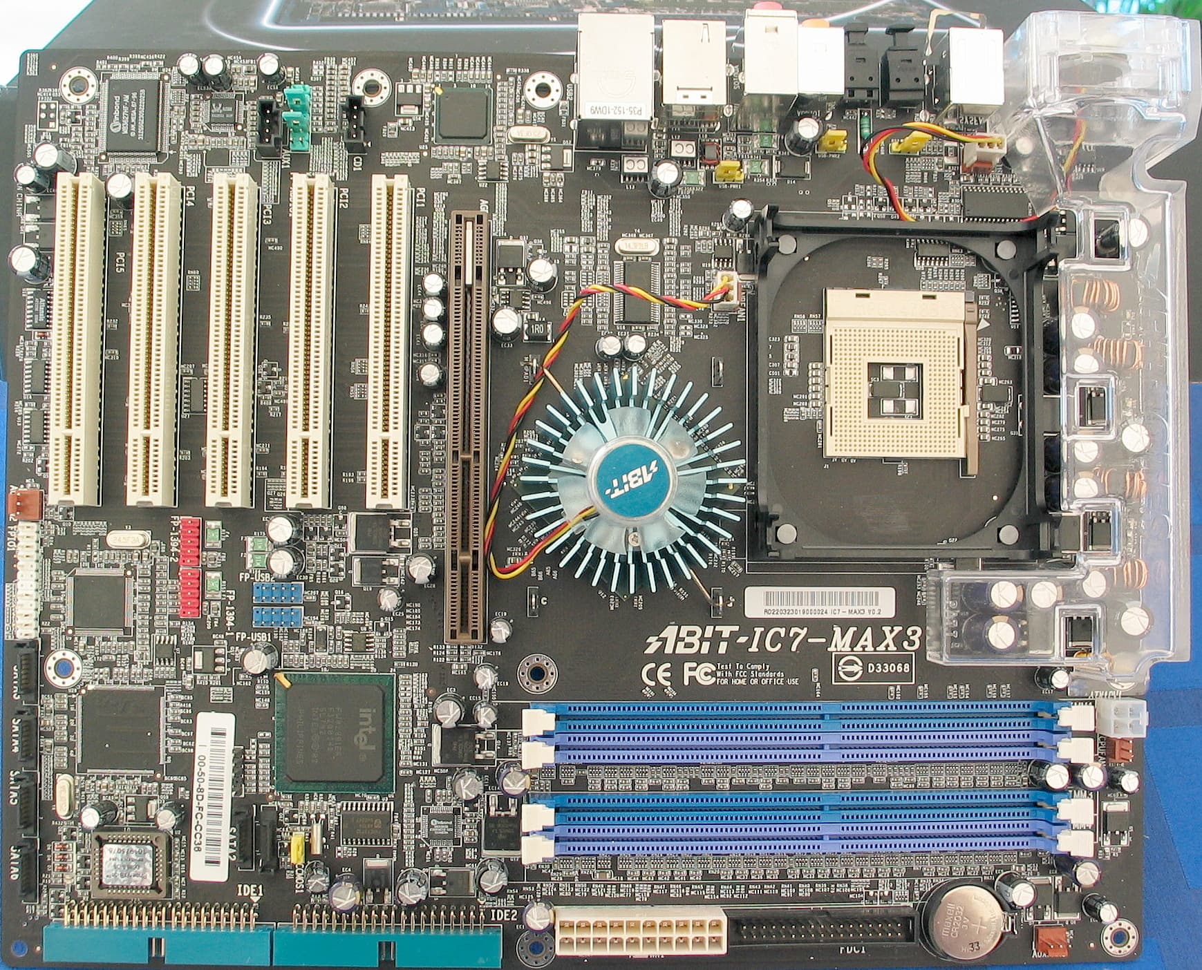 Теперь — несколько более подробных фотографий представленного на конференции образца платы ABIT, IC7-MAX3 (по гиперссылкам — увеличенные варианты фото):