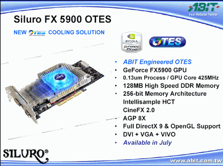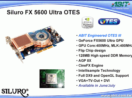 С top-end картой компании, Siluro FX 5900 OTES, вы, надеюсь, также уже знакомы по нашим новостям. Напомню ее краткие характеристики: чип GeForce FX5900, 128 Мб 256-битной памяти DDR, тактовая частота чипа — 425 МГц, интерфейсы — DVI, VGA, VIVO. Появление этой новинки в рознице ожидается уже в июле.