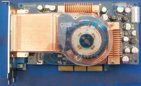 Разумеется, был представлен и полный ассортимент карт на чипах серии GF FX 5200. Нельзя не привести фото оригинального радиатора, обеспечивающего пассивное охлаждение чипов таких карт: