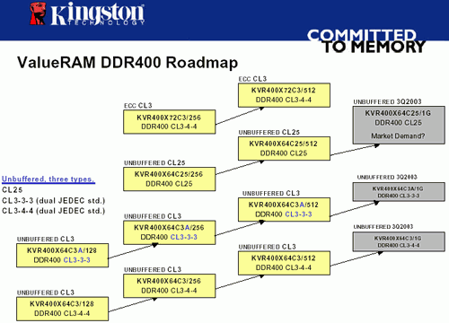 Вот таким образом выглядят ближайшие роадмэпы компании по выпуску столь востребованных ныне модулей PC3200 на чипах DDR400, в обоих классах:
