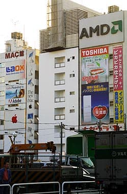Интересно обратить внимание на рекламу — большая ее часть выполнена на японском языке, однако встречающиеся среди иероглифов спасательные английские слова CD, DVD, NET, PC и прочее спасают иностранного покупателя. Есть и знакомые торговые марки (AMD, Adobe, IBM, Toshiba, Apple и пр.):