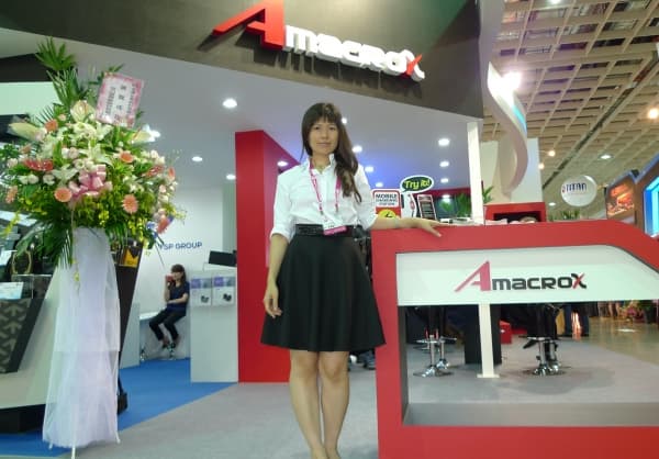 Гостеприимная хозяйка стенда — глава российского представительства FSP Group, Бренда Су (Brenda Su) — позирует именно на фоне стоек с логотипами Amacrox.