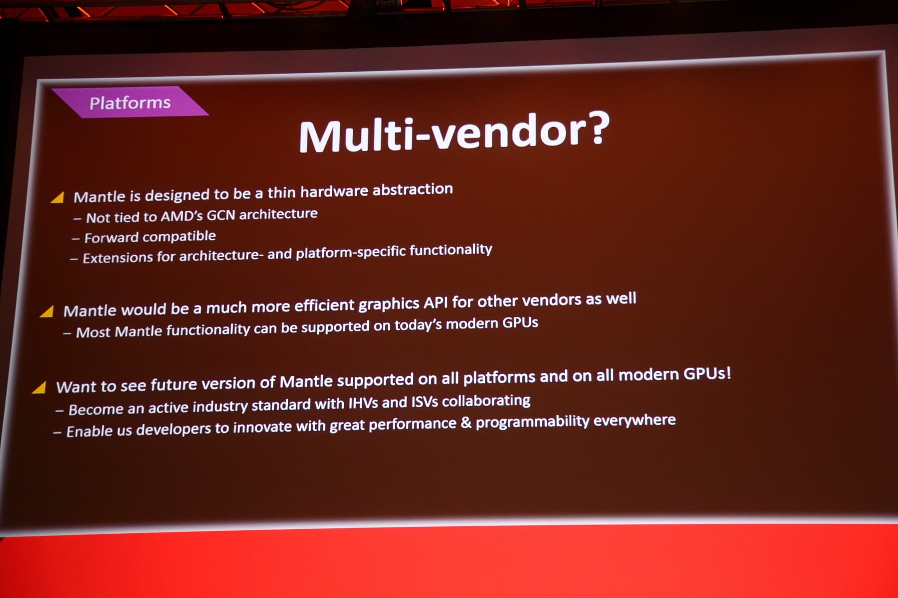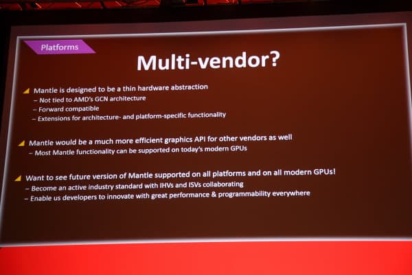 По словам и Геннадия Ригера и игровых разработчиков из указанных выше компаний, Mantle хоть и является «тонкой» прослойкой между аппаратным решением и игрой, но не ограничивается поддержкой лишь решений AMD. Более того, Геннадий уверяет, что разрабатывал новый API так, чтобы вынести все аппаратно-специфичные возможности в расширения API, а не в его ядро, и что GPU от других производителей должны эффективно работать в Mantle.