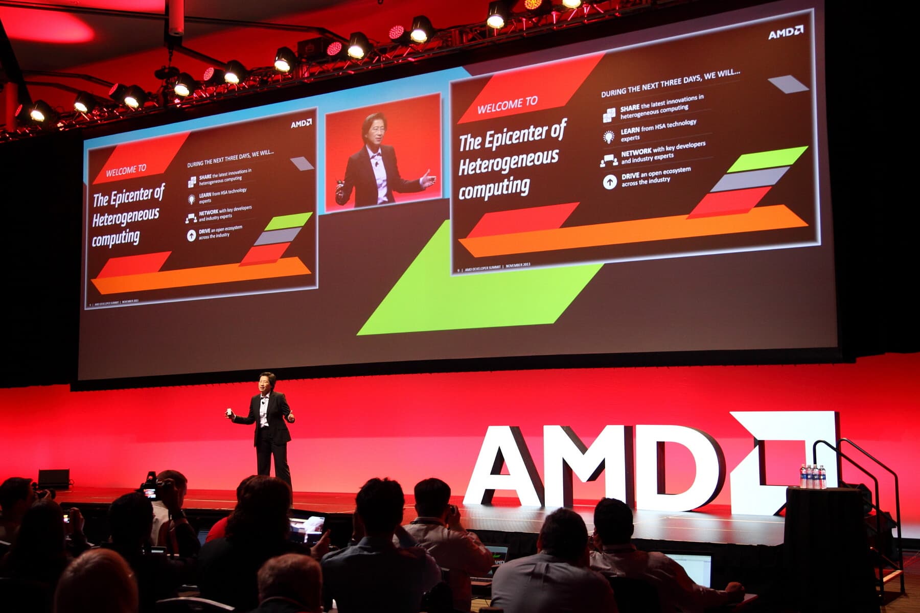 В первый день APU13 с ключевыми докладами выступили представители самой компании AMD. Докладчиков представлял Джон Тейлор — корпоративный вице-президент компании AMD по глобальным связям, он пригласил на сцену главную докладчицу этого дня Лизу Су (Lisa Su) — старшего вице-президента и генерального менеджера Global Business Units и она выступила с докладом: «Разработчики — сердце инноваций AMD».