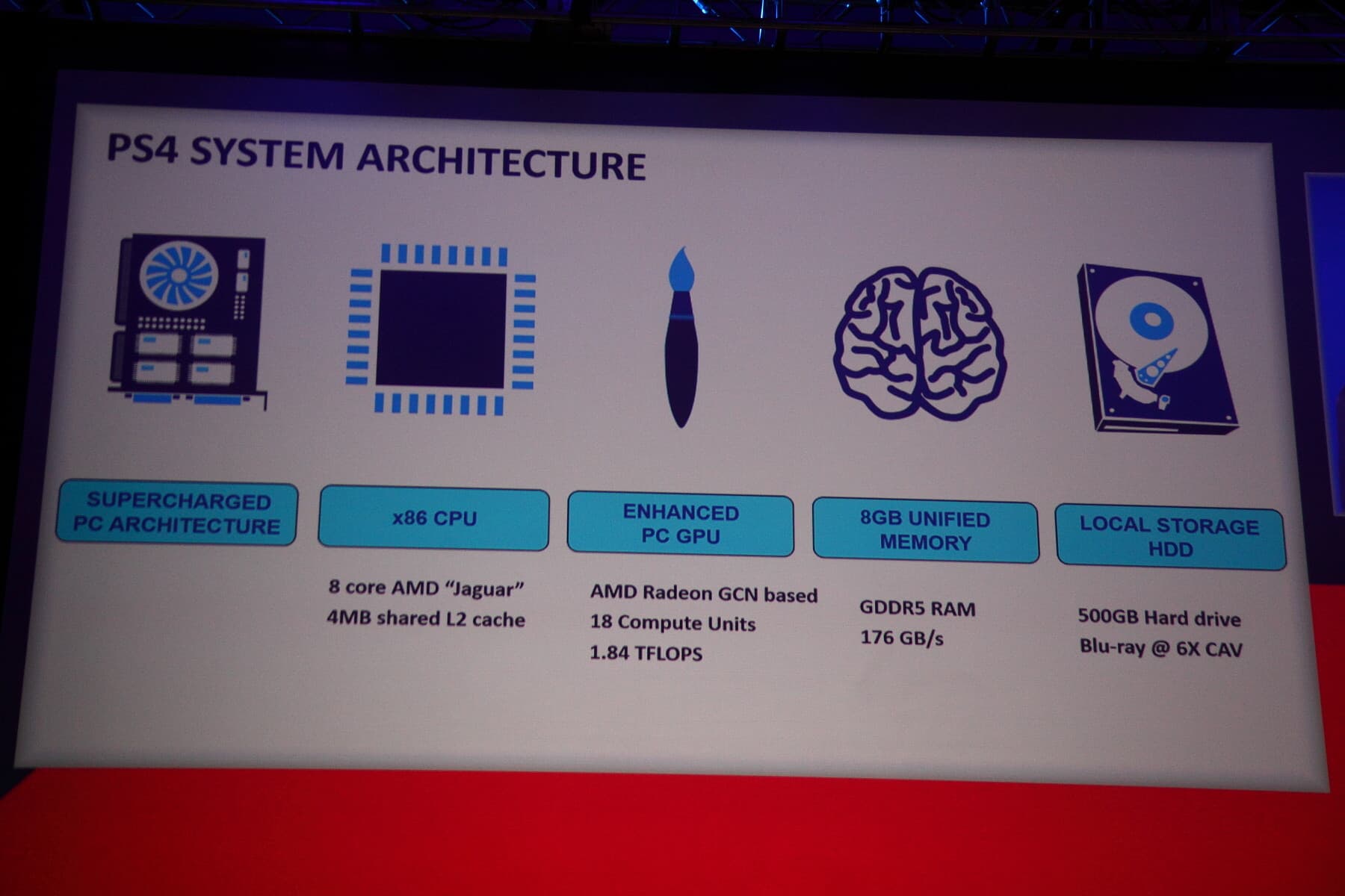 Поэтому Доминик рассказывал об истории торговой марки PlayStation и уже давно известной всем аппаратной конфигурации четвёртой модели. И «спасло» его от неинтересного выступления только то, что он сообщил о том, что центральный процессор (возможно, его нужно называть APU, согласно терминологии AMD) содержит в себе аудиопроцессор, поддерживающий технологию TrueAudio, аналогично видеочипам в моделях AMD Radeon R7 260X и R9 290(X).