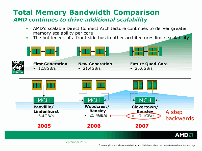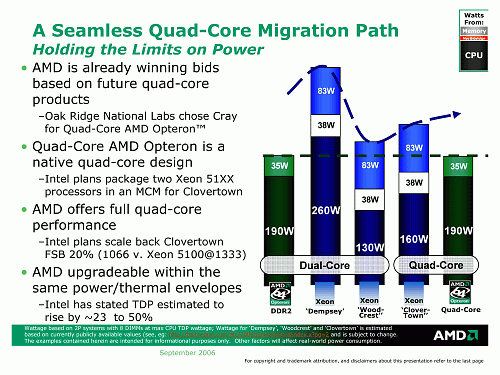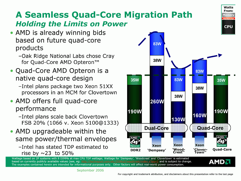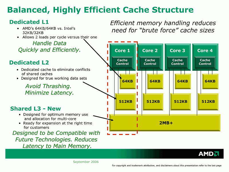 Принципиальным, по мнению представителей AMD, отличием ее четырехъядерных процессоров, от, готовящихся к выпуску уже в четвертом квартале 2006 года, процессоров Intel на ядре Kentsfiled/Clovertown, является «естественная» четырехъядерность — все четыре ядра помещаются на одном кристалле и имеют общую кэш-память. Тогда как Intel лишь «склеивает» два кристалла из существующего ныне двухъядерного семейства Conroe/Woodcrest, чтобы ускорить выход своего продукта. Поскольку взаимодействовать процессорам в таком случае приходится через внешнюю шину и чипсет, такой подход напоминает использовавшийся в Pentium D, и, конечно, не вызывает восторга изяществом технического решения. Также Intel придется снизить частоту шины с 1333 до 1066 МГц, что тоже нельзя назвать прогрессом. С другой стороны, конечным потребителям, как правило, безразлично, насколько красиво, с инженерной точки зрения, реализована начинка приобретаемой техники, поэтому решающее слово будут иметь тесты производительности готовых продуктов.