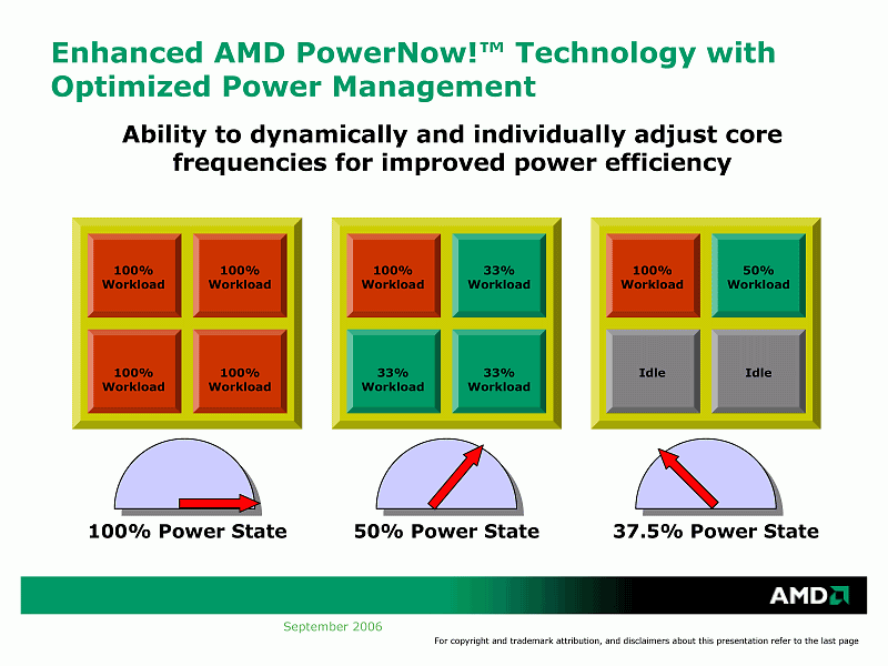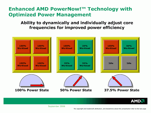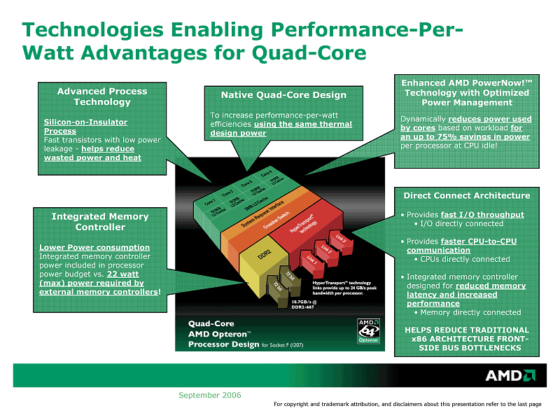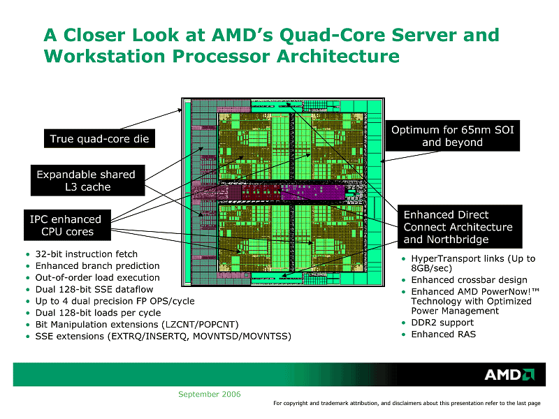 - интеграция четырех ядер на один кристалл, выпускаемый по нормам 65 нм SOI техпроцессора, с сохранением теплового пакета, характерного для нынешних двухъядерных процессоров;