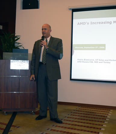 «Официальную часть» провел Пьер Брансвик, вице-президент по продажам и маркетингу в СНГ, Восточной Европе и Турции, судя по регулярному присутствию на пресс-мероприятиях, уже прочно обосновавшийся в Москве. Кстати, «генеральская» должность для сотрудника, занимающегося «нашим» регионом, косвенно, но вполне объективно, демонстрирует, что AMD считает этот регион стратегически важным.