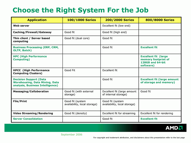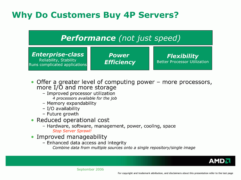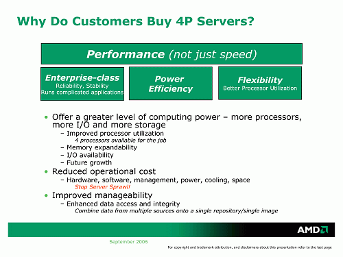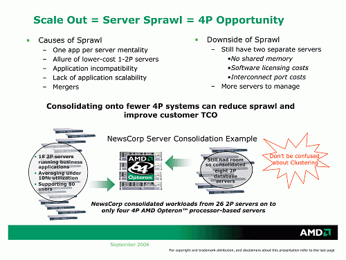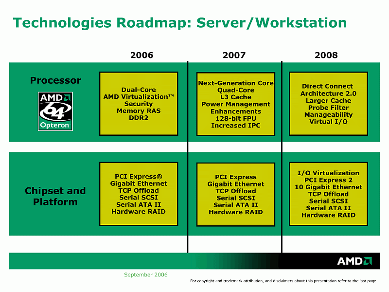 Прогнозы на 2007 и 2008 год в отношении серверного сегмента не претерпели особых изменений по сравнению с аналогичным «цебитовским» слайдом. Впрочем, одно дополнение весьма интересно — архитектура Direct Connect к 2008 году будет обновлена до второй версии, и одно из новшеств называется Probe Filter. Дело в том, что, несмотря на планируемое увеличение пропускной способности шины Hyper-Transport для версии 3.0 до 10,4 Гбайт/c в каждом направлении, в тех случаях, когда она используется для соединения между собой процессоров (а не подключения периферии), с ростом числа процессоров, внутренний трафик может превратить ее в узкое место всей системы. А с планируемым появлением четвертого HT-канала у старших моделей Opteron, AMD упрощает (и поощряет) задачу построения 8-процессорных конфигураций. Означенный «фильтр» должен разгрузить эту шину за счет пересылки между кэш-памятями процессоров лишь необходимой информации! Технические детали пока не разглашаются, и серверные гуру могут придумать свои способы реализации (чтобы со временем сравнить с оригиналом).
