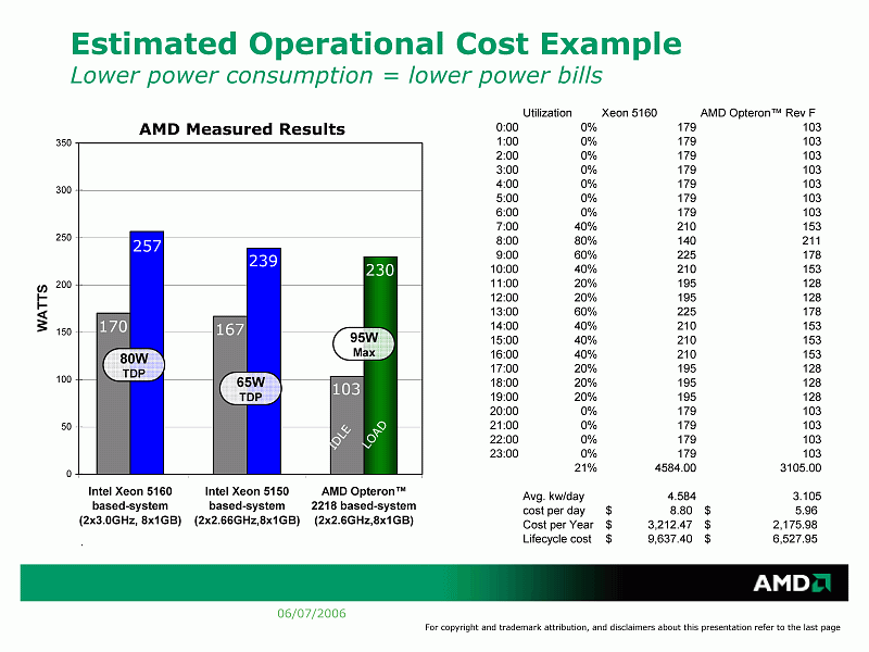На данном слайде, Джузеппе Амато, не отказал себе в удовольствии сравнить ситуацию с энергопотреблением в нынешних многопроцессорных системах, где со стороны Intel выступает один из немногих «оставшихся в живых» представителей поколения Netburst — Xeon MP на ядре Paxville. Зрелище, как и следовало ожидать, получилось душераздирающее :)