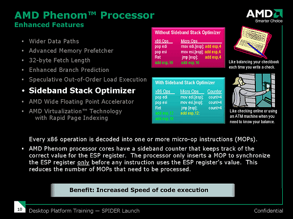 Операции со стеком очень распространены в программах, но при интерпретации x86-команд работы со стеком в микрооперации процессора до сих пор возникала необходимость в добавлении к каждой такой команде дополнительной микрооперации, модифицирующей значение регистра ESP (указатель на верхушку стека), Phenom самостоятельно следит за текущим положением указателя, а операция обновления значения ESP добавляется в код автоматически перед командами, в которых данный регистр упоминается в явной форме.